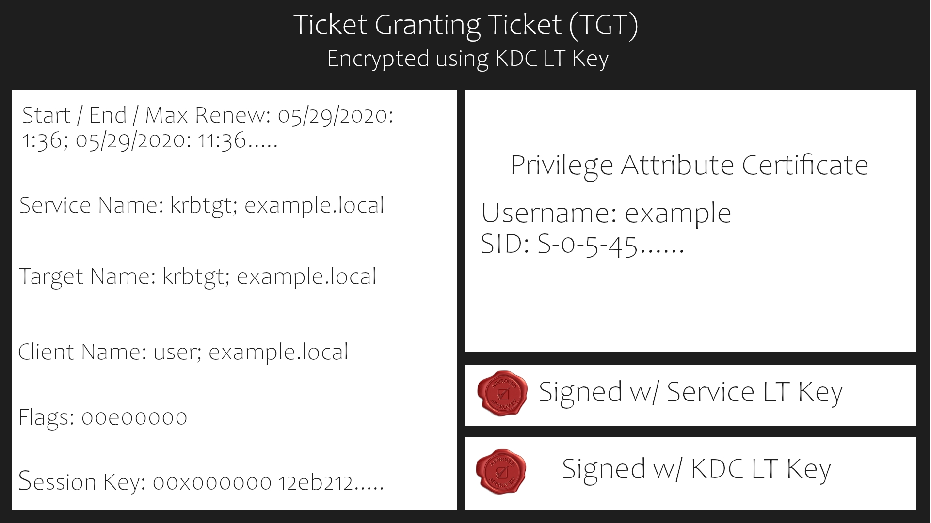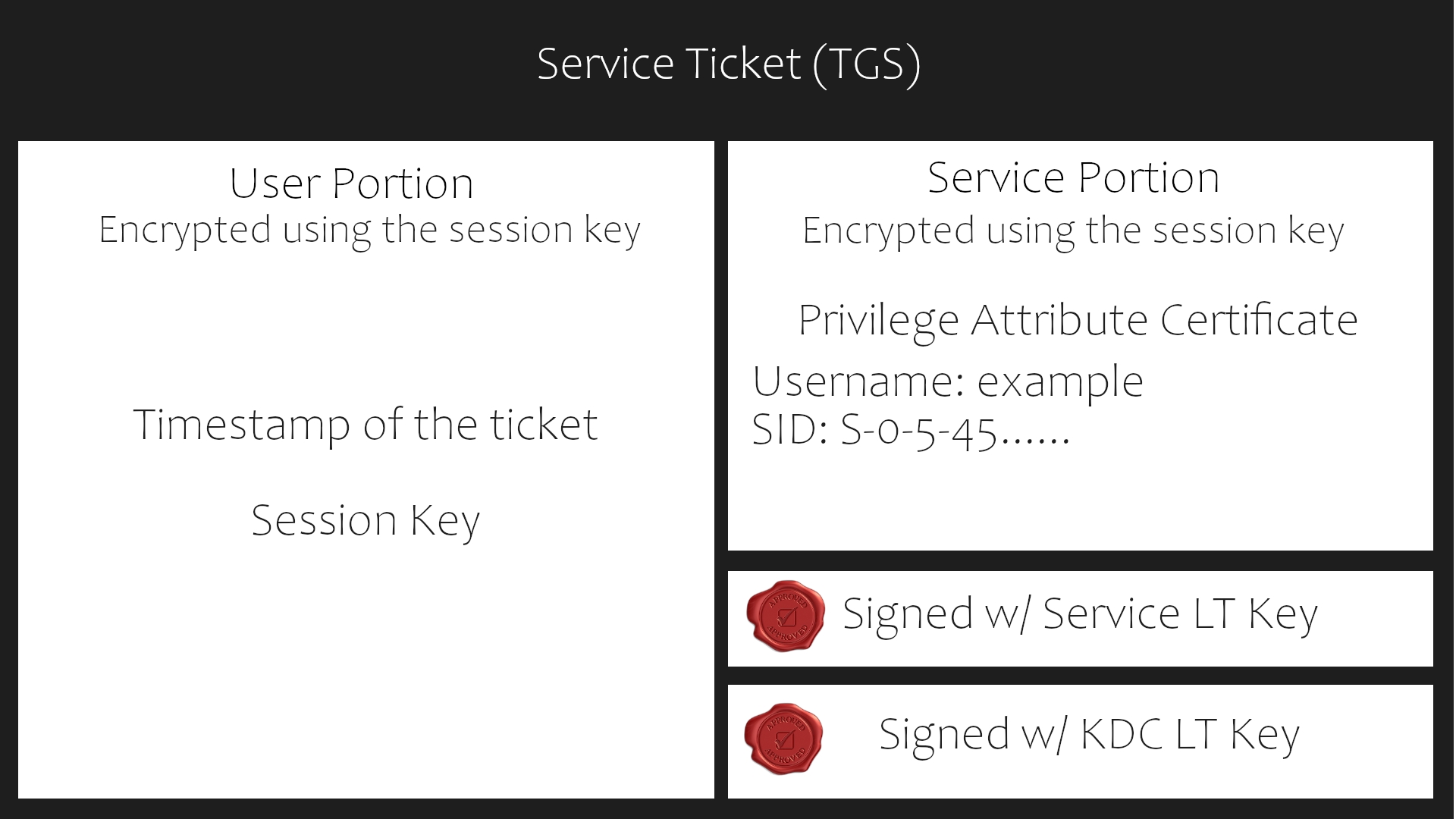 So what does a ticket contain? Basically tickets contains a client's Id, service ID, session keys, timestamp, time to live and other informations which are encrypted using a server's secret key.